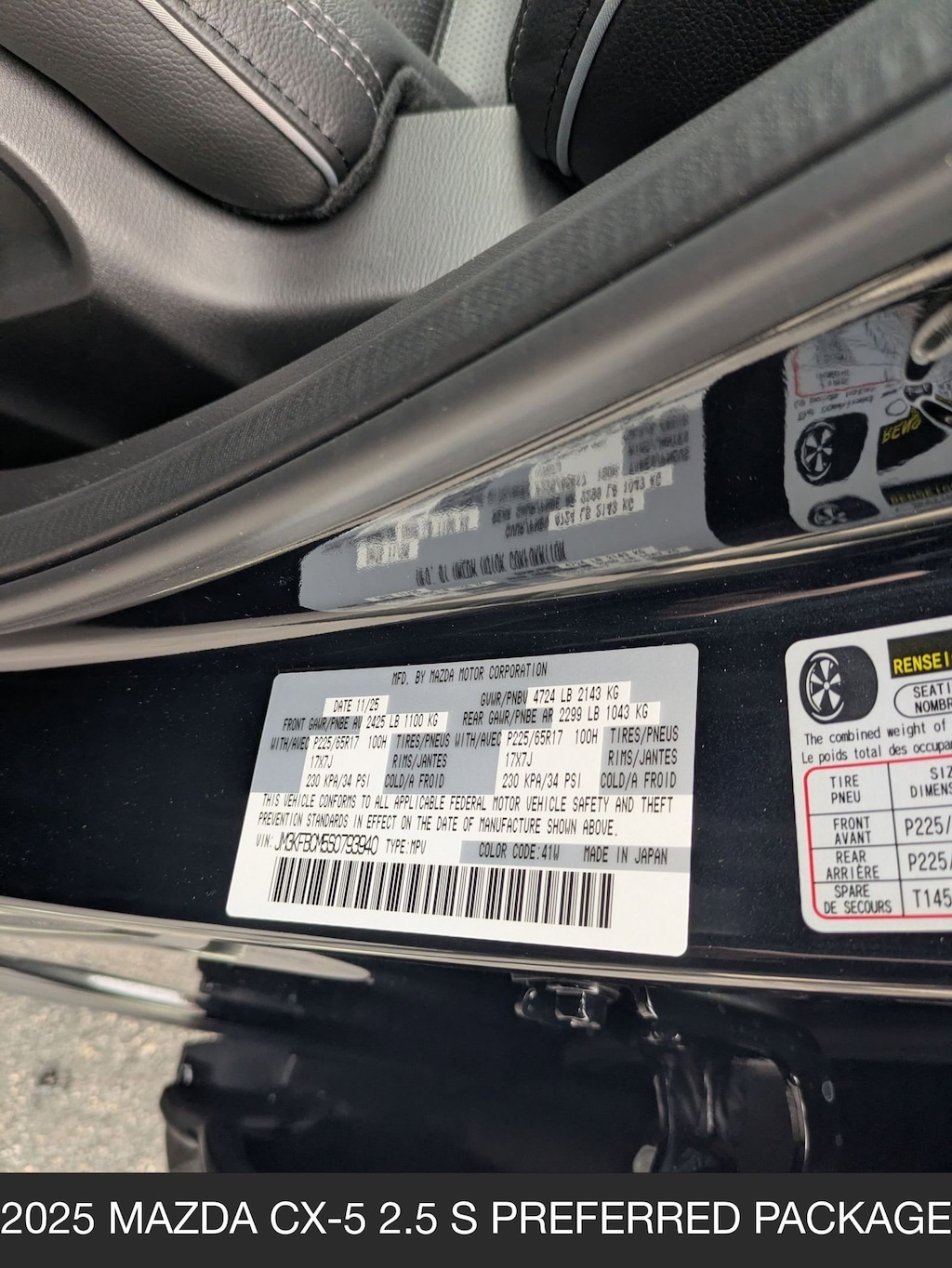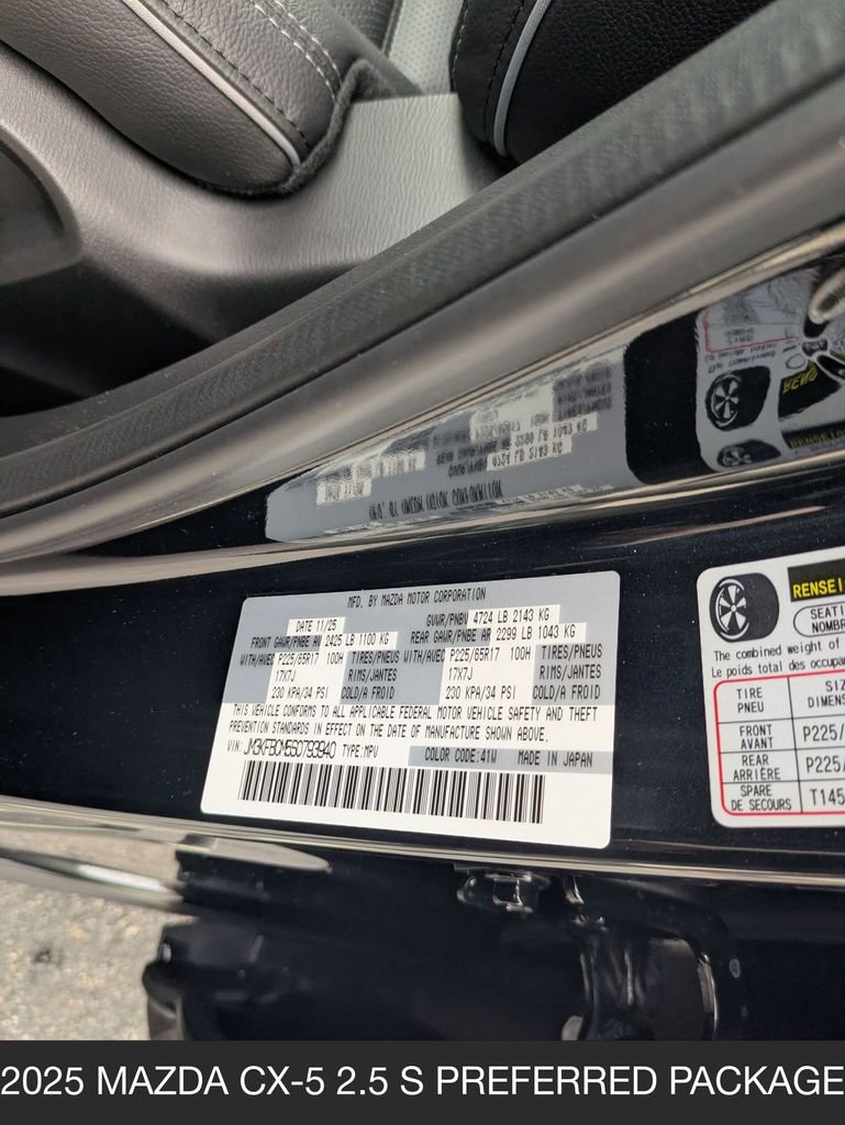 Jet Black Mica 2025 Mazda CX-5 2.5 S Preferred Package AWD 4D Sport Utility 6-Speed Automatic SKYACTIV® 2.5L 4-Cylinder DOHC 16V 26/30 City/Highway MPG