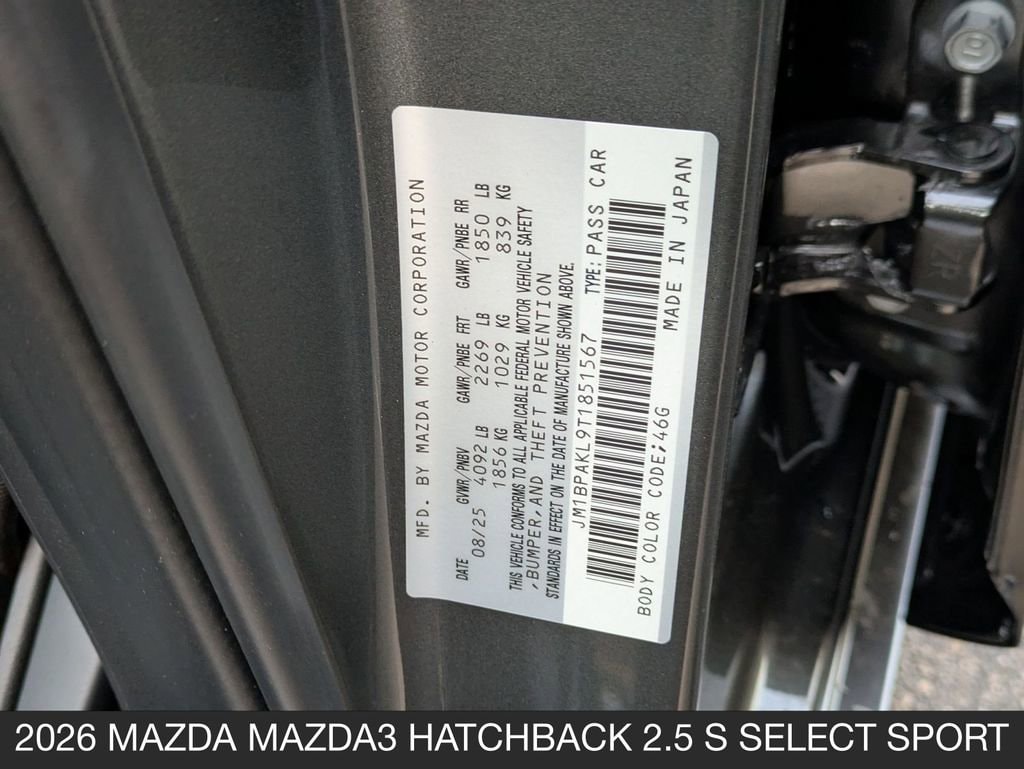 Machine Gray Metallic 2026 Mazda Mazda3 2.5 S Select Sport FWD 4D Hatchback 6-Speed Automatic SKYACTIV® 2.5L 4-Cylinder DOHC 16V 26/34 City/Highway MPG