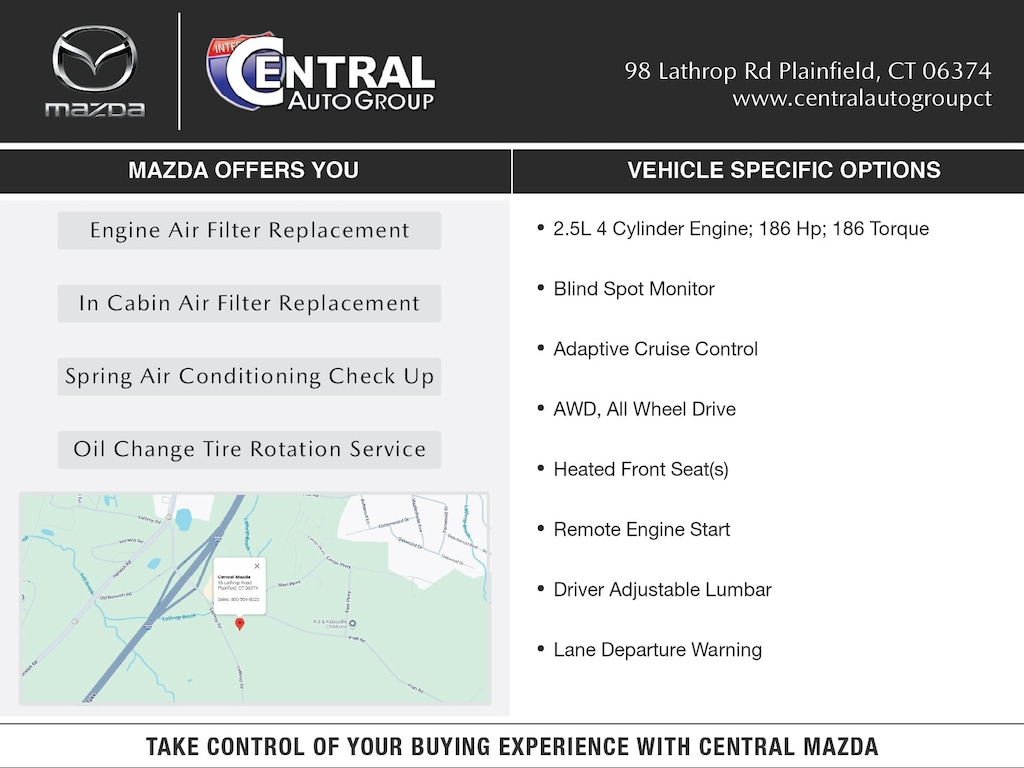 Call Central Mazda for availability! 860-564-4014 Will not last!, AppLink/Apple CarPlay and Android Auto, Auto High-beam Headlights, Blind Spot Monitoring w/Rear Cross Traffic Alert, Dual-Zone Automatic Climate Control System, Exterior Mirrors w/Memory Positioning, Exterior Parking Camera Rear, Front dual zone A/C, Front Grille Black Gloss Paint, Gloss Painted Speaker Grille, Heated Front Bucket Seats, Illuminated entry, Illuminated Vanity Mirrors, Leather steering wheel, Leather-Wrapped Steering Wheel & Gear Shift Knob, Leatherette Seat Trim, Mazda Advanced Keyless Entry, Memory seat, Overhead Console w/Sunglass Holder, Power driver seat, Preferred Package, Rain sensing wipers, Rear Privacy Glass, Rear Seat Armrest w/Cupholders, Shark Fin Antenna, Side Mirror Turn Lamps, Speed control, Steering wheel mounted audio controls, Telescoping steering wheel, Turn signal indicator mirrors, Wheel Locks.
