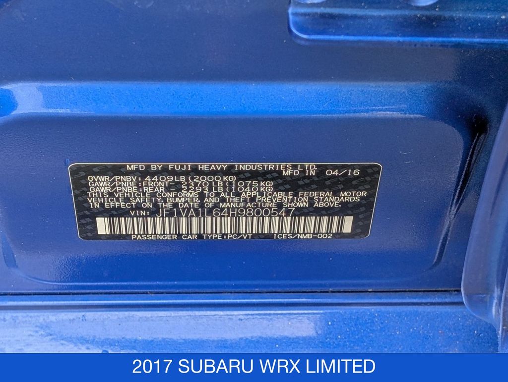WR Blue Pearl 2017 Subaru WRX Limited 4D Sedan AWD 6-Speed Manual 2.0L DOHC Intercooled Turbocharged 20/27 City/Highway MPG